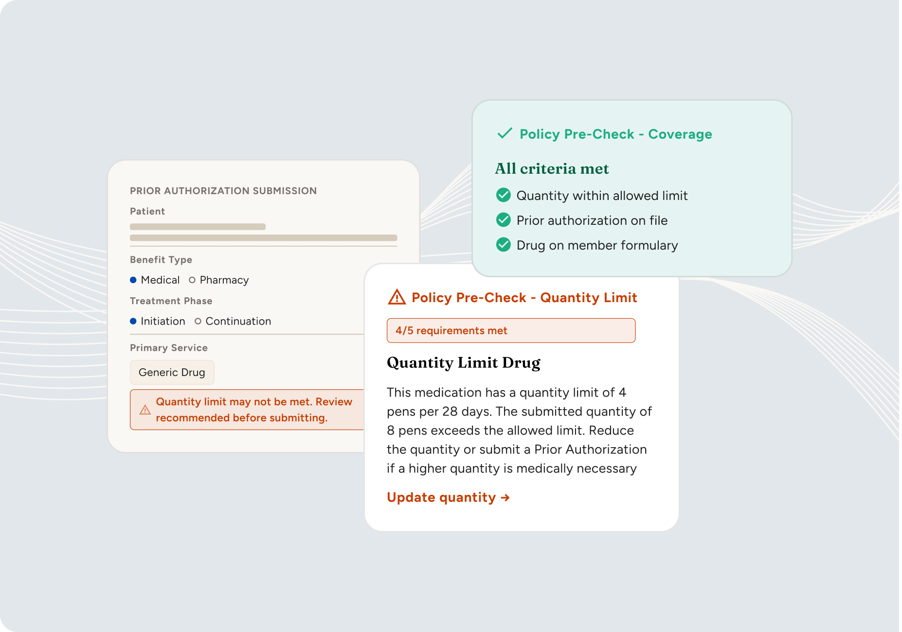 Prevent non-starts and discontinuations with real-time medical benefit prior authorization insights and AI-enabled support embedded directly into specialty practice workflows.